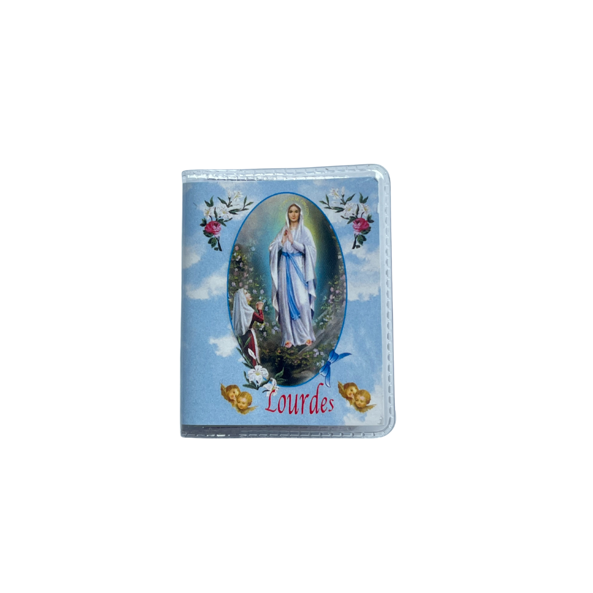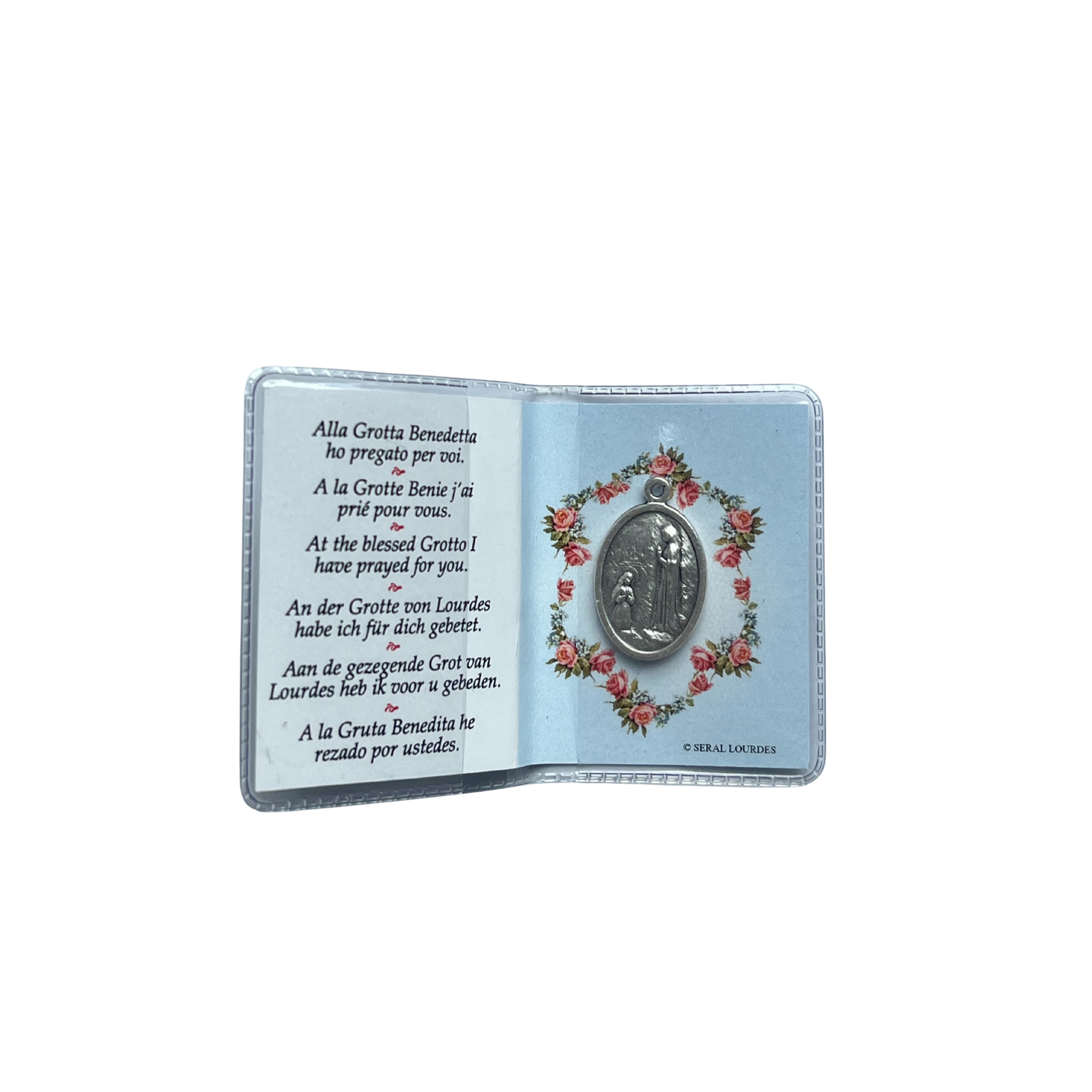 Carte prière multilingue en format livret (5 cm) contenant une prière et une médaille incluse