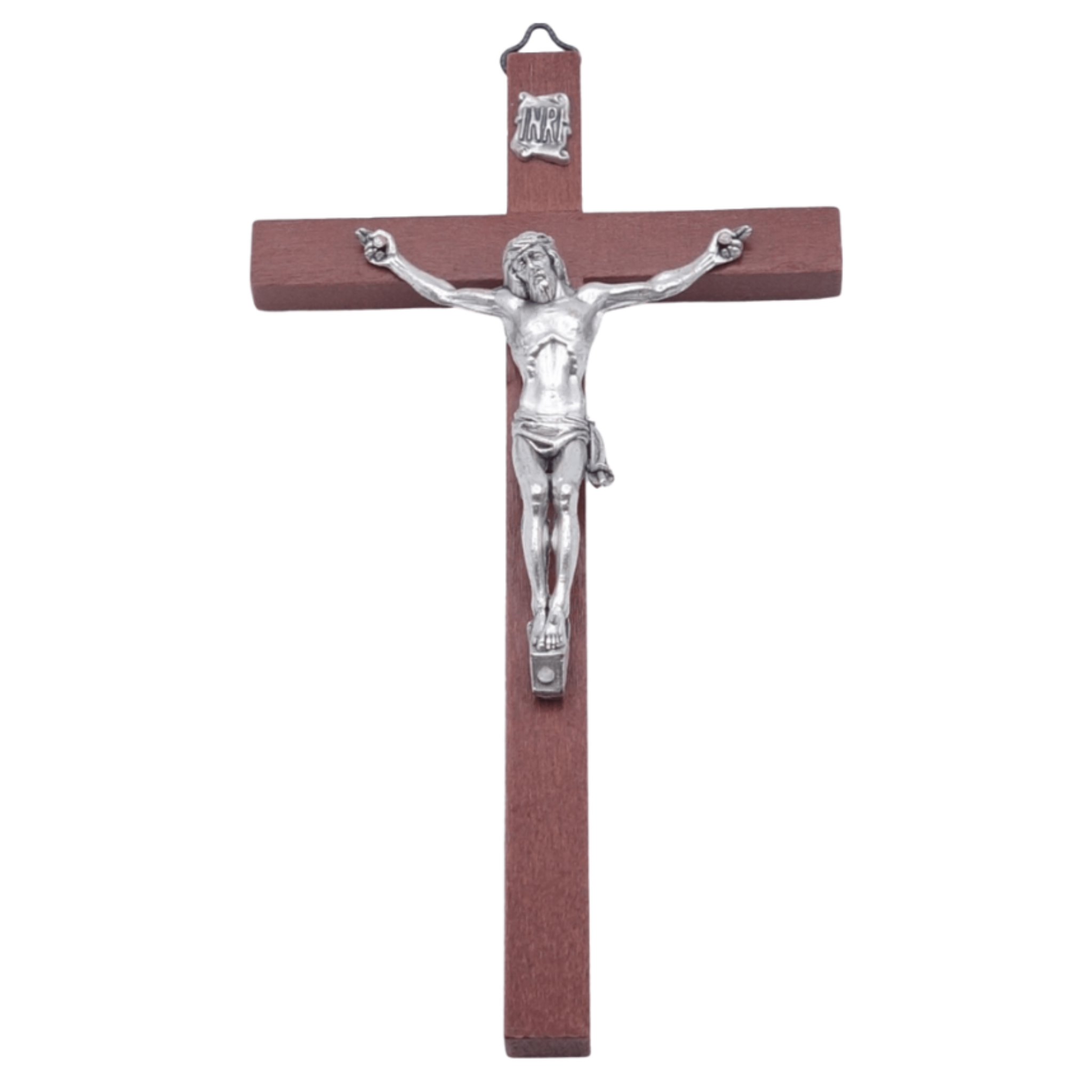 Ce crucifix mural fin et élégant met en valeur la silhouette de Jésus en métal argenté, accompagnée de la traditionnelle plaque “INRI” au-dessus de sa tête, également en argenté. Sa croix fine confère à l’ensemble une apparence délicate et raffinée, idéale pour une décoration discrète mais pleine de symbolisme.