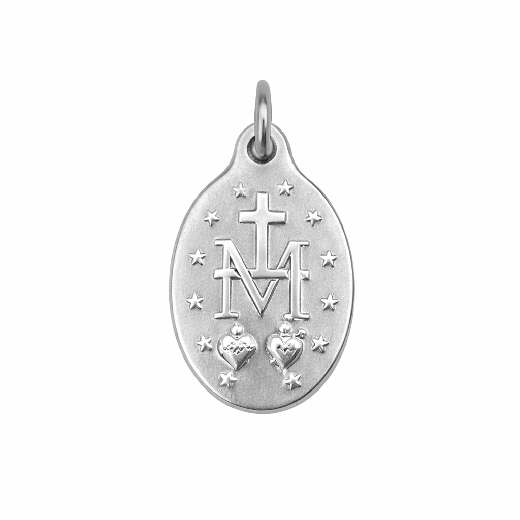 Au verso, on retrouve les symboles emblématiques : le M entrelacé à la croix, les douze étoiles ainsi que les deux Cœurs sacrés, tous finement gravés pour une finition nette et harmonieuse.